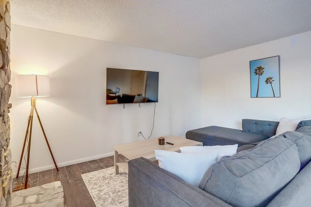 The living room is the perfect place to unwind, boasting a very big and comfortable sectional couch that can accommodate the whole family. A stone-covered gas fireplace adds a touch of Flintstones vibes, creating a cozy ambiance. In front of the sectional couch, there is a 58-inch smart TV, allowing you to kick back and enjoy your favorite shows.