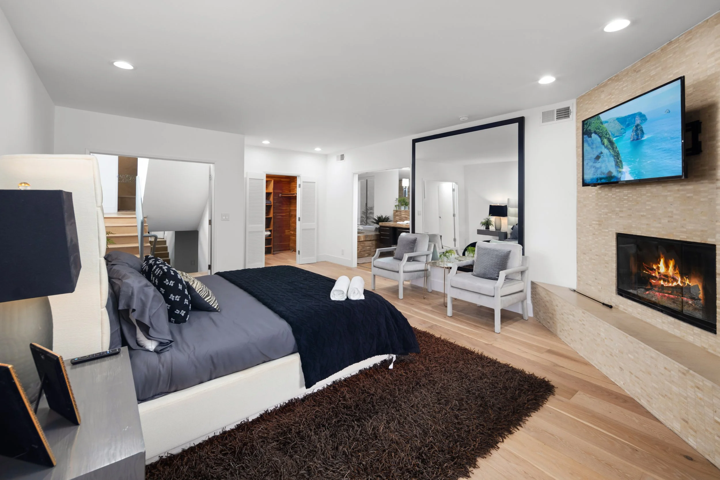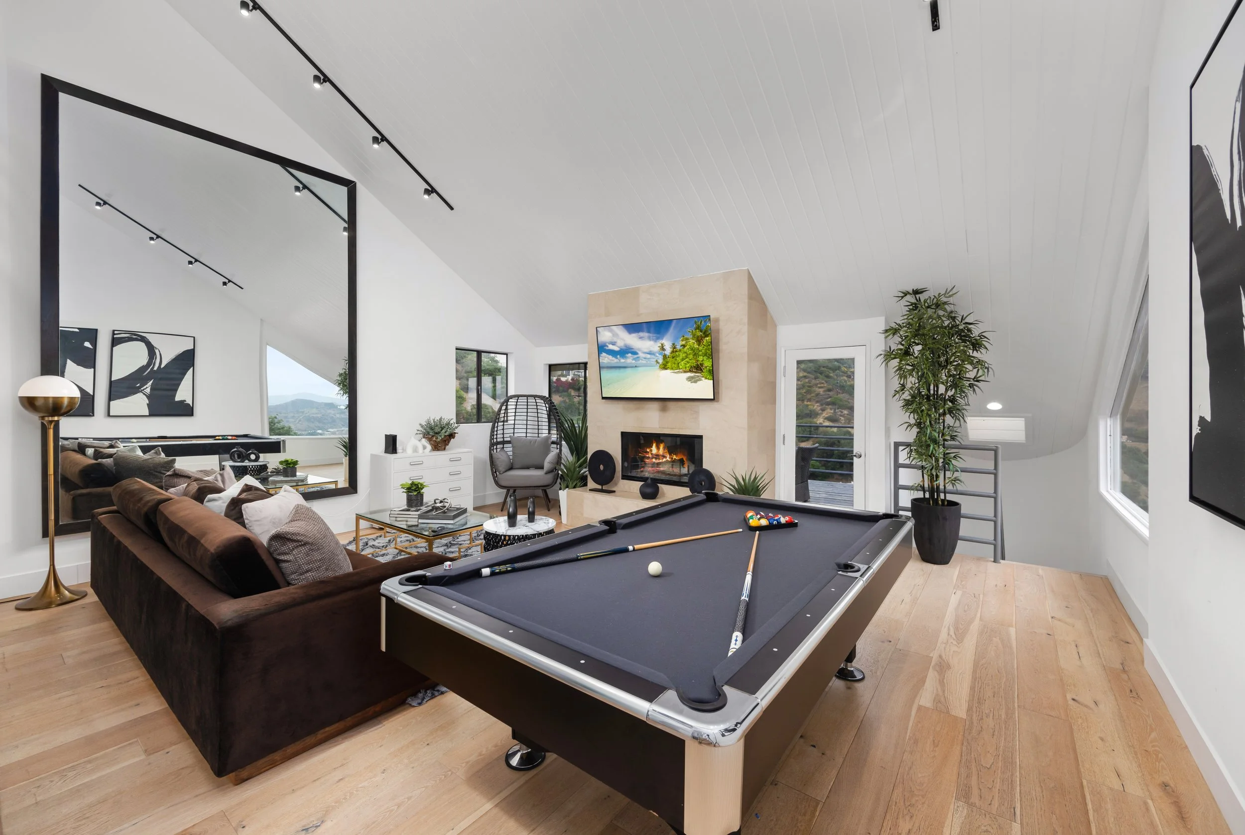 The master bedroom is a haven with its own fireplace, huge walk-in closet, and a spa-like bath, providing the ultimate in relaxation. For entertainment, we also have a pool table on the property.